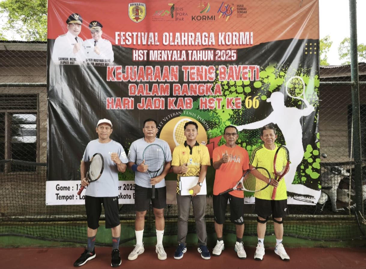 Borneo24jam.com,BARABAI – Pasangan H. Yayan/H. Anwar berhasil meraih juara pertama pada Kejuaraan Tenis Baveti U45 dalam rangka Festival Olahraga KORMI HST Menyala, yang digelar untuk memeriahkan Hari Jadi ke-66 Kabupaten Hulu Sungai Tengah (HST), bertempat di Lapangan Tenis Murakata Barabai, Minggu (14/12/2025).