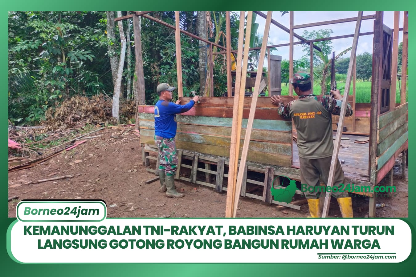 Borneo24jam.com,BARABAI – Wujud kepedulian terhadap masyarakat terus ditunjukkan oleh Babinsa Koramil 1002-03/Haruyan yang hadir langsung dalam kegiatan gotong royong pembangunan rumah layak huni milik Sahdan (46), seorang petani di Desa Andang, Kecamatan Haruyan, Kabupaten Hulu Sungai Tengah, Senin (13/4).