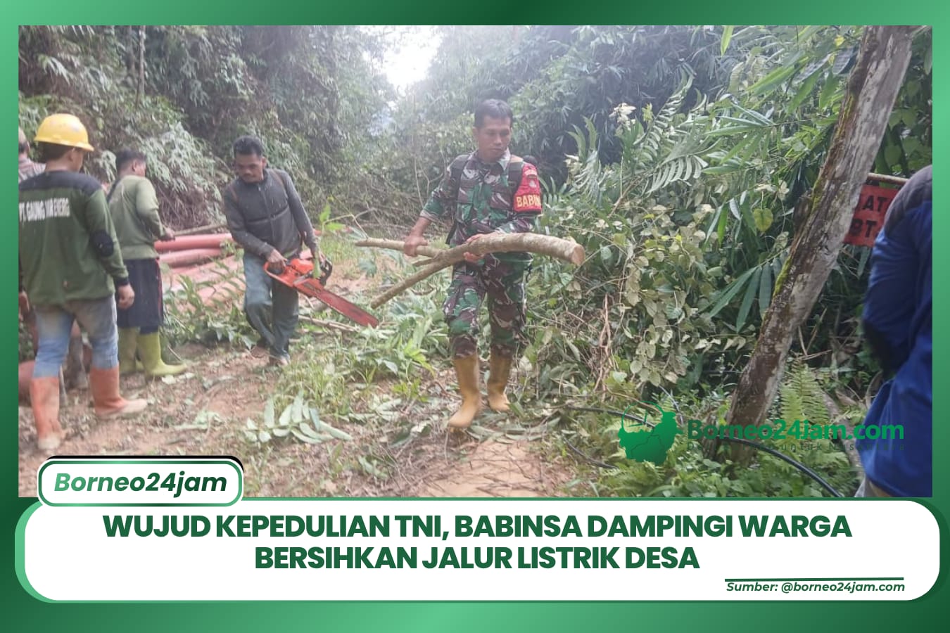 Borneo24jam.com,BARABAI – Babinsa Koramil 1002-01/Batang Alai Selatan, Serda Erli Sepriyanto bersama warga masyarakat Desa Atiran melaksanakan kegiatan gotong royong pembersihan jalan sepanjang kurang lebih 2,5 kilometer dalam rangka penyiapan instalasi program listrik desa, Selasa (7/4).